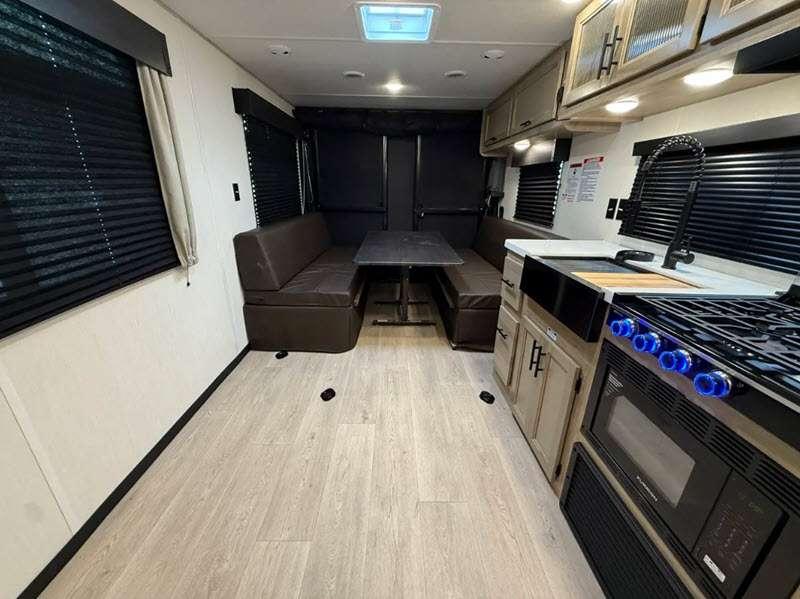 Sleeps 6 Slides 1 Length 34 ft 2 in Ext Width 8 ft Ext Height 10 ft 8 in Int Height 0 ft Hitch Weight 1244 lbs GVWR 9995 lbs Dry Weight 7355 lbs Cargo Capacity 2640 lbs Fresh Water Capacity 52 gals Grey Water Capacity 38 gals Black Water Capacity 38 gals Furnace BTU 20000 btu Available Beds RV King Refrigerator Type 12V Cooktop Burners 3 Number of Awnings 1 Garage Size 11 ft Water Heater Type Tankless AC BTU 15000 btu Awning Info 15' Full Length Power w/LED Light Strip Axle Count 2 Shower Type Standard Solar Wattage 200 watts Similar Floorplans