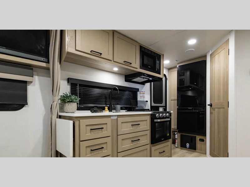 Each model is constructed with a fully laminated walkable roof, 6-sided full-aluminum frame, and a fiberglass front cap with Clear Coat for added protection. You will appreciate the slam baggage doors and 200W solar panel outside, plus there is a Climate Protection Package for better insulation. Inside, you'll love the solid surface countertops, roller shades, and soft close roller bearing drawers.